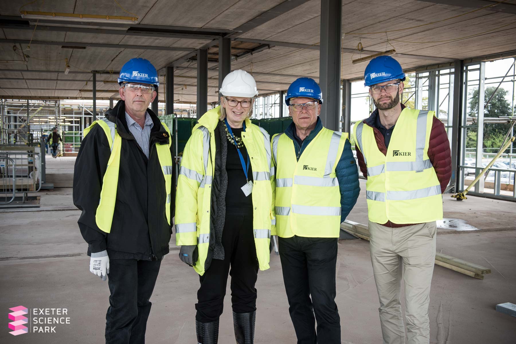 (RtoL): James Hill, Operations Director, Dealerweb; Martin Hill, MD, Dealerweb; Dr Sally Basker, CEO, Exeter Science Park; and Jim Moore, Admin & Complaince Manager, Dealerweb visit the site of the new Dealerweb (Eight Technology) office.